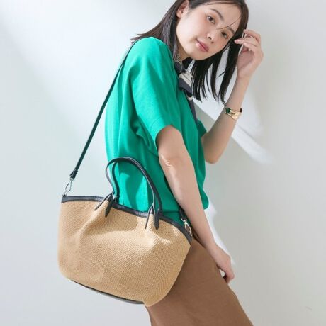 夏らしいペーパー素材を丁寧に編み込んだような、かごバッグ風のミドルサイズバッグ。