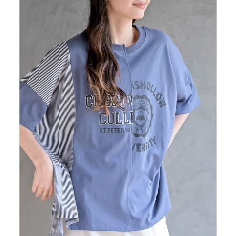 異なるロゴTと爽やかなストライプ地を組み合わせた存在感のあるデザインになっています。