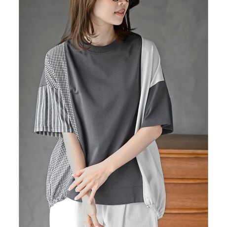 柔らかなカットソーにチェックとストライプの布帛を組み合わせた異素材トップス。