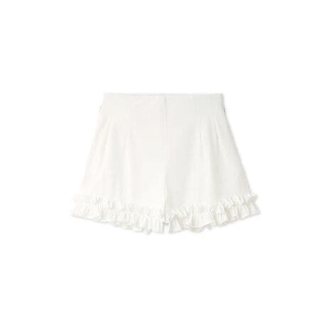 裾にフリルデザインが施されていて細見え効果◎。さらに裾広がりのシルエットなので、ヒップラインを拾わず、太ももがすっきりと細見えします。