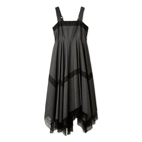 後ろ姿まで余韻を残すアシンメトリーなイレギュラーヘムが魅力のジャンパースカート。ギャザーを効かせた太めの肩紐が上半身にメリハリを与えてくれます。2種類のレースをドッキングすることで奥行きのある表情をプラス。ボリューミーなフォルムながら、裾にレースをあしらうことで軽やかな印象に。肩紐と後ろのシャーリングでサイズを調整いただくことが可能です。