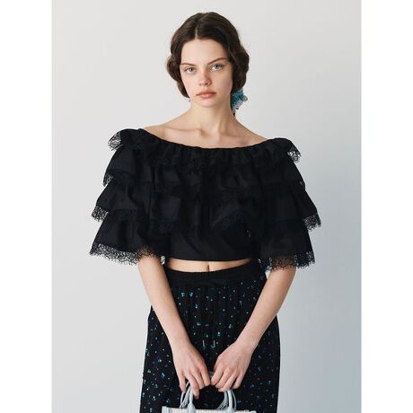 大胆なフリルが目を惹くアイテム。たっぷりとギャザーを入れたフリルを重ね、フリル先には繊細なレーステープをあしらっております。身体にフィットするように後身頃をシャーリング仕様にしているのもこだわりのポイント。オフショルダーとしても着用でき、様々なコーディネートを楽しんでいただけるアイテムになっております。