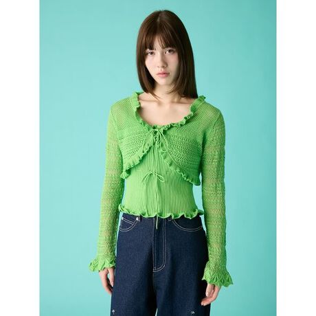 フリルやトリミングの位置を調整することで、着用時のシルエットに動きと華やかさをプラスした1枚。キャミソールとカーディガンはそれぞれ単品での着用もでき、重ねて着用するとより魅力的に、さまざまな楽しみ方のできるアイテムです。