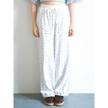 ミニフラワー柄の中にさりげなくチェリーのモチーフを組み合わせた、FURFURらしいオリジナル柄をプリントしました。ワーク調のポケットディテールが特徴的なスウェットパンツです。裾に丸ゴムを通しているため、お好きなシルエットで着用いただけます。絞った丸ゴムは内側のタブに収納可能なので、裾ゴムが垂れることなく着用いただけます。