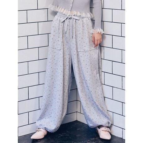 ミニフラワー柄の中にさりげなくチェリーのモチーフを組み合わせた、FURFURらしいオリジナル柄をプリントしました。ワーク調のポケットディテールが特徴的なスウェットパンツです。裾に丸ゴムを通しているため、お好きなシルエットで着用いただけます。絞った丸ゴムは内側のタブに収納可能なので、裾ゴムが垂れることなく着用いただけます。