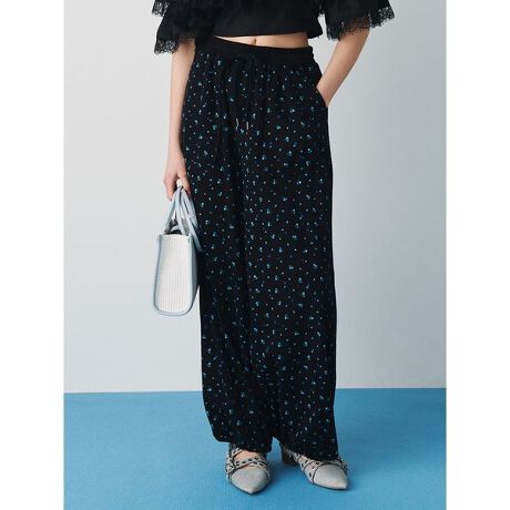 ミニフラワー柄の中にさりげなくチェリーのモチーフを組み合わせた、FURFURらしいオリジナル柄をプリントしました。ワーク調のポケットディテールが特徴的なスウェットパンツです。裾に丸ゴムを通しているため、お好きなシルエットで着用いただけます。絞った丸ゴムは内側のタブに収納可能なので、裾ゴムが垂れることなく着用いただけます。