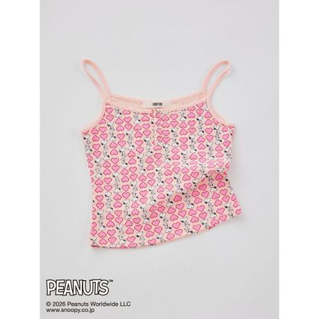 「スヌーピー」とのコラボアイテム。目を惹くビビッドな配色の総柄スヌーピープリントがポイントのキャミソール。前身頃の衿元にあしらったリングスナップがアクセント。前後の衿元に特殊ミシンでさりげなくスカラップの刺繍を施しています。コーディネートを華やかな印象に仕上げる一枚です。