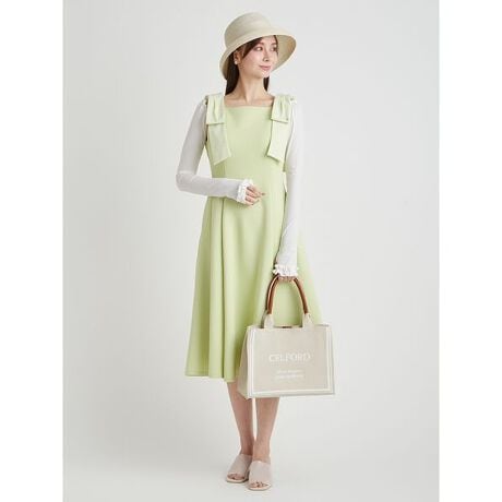 肩のリボンは取り外し可能となっており、シーンに合わせてご着用いただけます。パネル切り替えの美しいフィット&フレアシルエットに仕上げ、タウンユースはもちろん、リゾートなどのお出かけにもピッタリの1枚となっています。