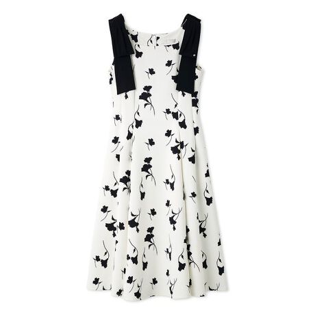肩のリボンは取り外し可能となっており、シーンに合わせてご着用いただけます。パネル切り替えの美しいフィット&フレアシルエットに仕上げ、タウンユースはもちろん、リゾートなどのお出かけにもピッタリの1枚となっています。