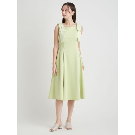肩のリボンは取り外し可能となっており、シーンに合わせてご着用いただけます。パネル切り替えの美しいフィット&フレアシルエットに仕上げ、タウンユースはもちろん、リゾートなどのお出かけにもピッタリの1枚となっています。