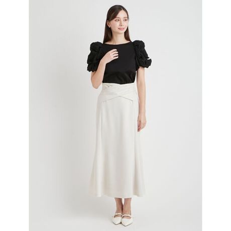 ツイストデザインのウエストマークがポイントのマーメイドスカート。前ウエストの斜めのデザインは腰回りをさりげなくカバーしつつ、シャープな印象を与えます。