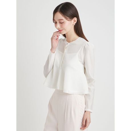 襟ぐりには繊細なアイレットを施し、ビジューボタンを一粒あしらうことで、顔まわりに華やぎを添えました。