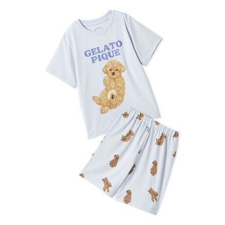 ごろんと寝そべりお腹を見せたりお座りしたり、いろんなポーズのワンちゃんをプリントした、ファミリーでお楽しみいただけるドッグ柄シリーズです。お腹を見せている2種類のワンちゃんを大きくプリントした、愛嬌たっぷりのTシャツと、総柄のショートパンツを組み合わせたJUNIORサイズのセットアップ。甘えん坊な表情や、ほんのりピンクのお腹までこだわって表現しました。色はポメラニアン柄のクリーム、トイプードル柄のブルーの2色展開。LADIES’、HOMME、KIDS、BABYアイテムとリンク・コーディネートしたり、春の新生活に向けたギヅトにもおすすめです