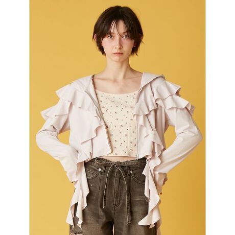 【紫外線遮蔽率(UVカット率):96%以上】UVカット機能のある、華やかなフリル使いが印象的なパーカー。優しい肌触りと伸縮性に優れた素材を使用し、着心地にもこだわりました。少し大きめのフードとサムホールがついており、手の甲まで紫外線から守れるデザインとなっております。短めの着丈なので様々なボトムスと相性がよく、1枚で華やかな印象になるアイテムです。ご自宅でもお洗濯可能なのも嬉しいポイント。