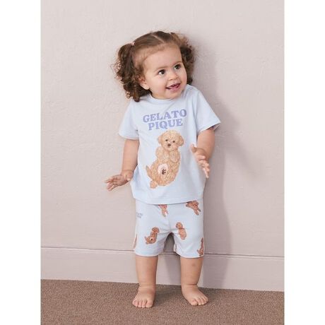 ごろんと寝そべりお腹を見せたりお座りしたり、いろんなポーズのワンちゃんをプリントした、ファミリーでお楽しみいただけるドッグ柄シリーズです。とろみのあるレーヨンを使用した、総柄プリントのBABYショートパンツ。季節の変わり目にちょうど良い素材感で、汗ばみやすい初夏にかけても快適にはいていただけます。明るい気分を演出する春らしいカラーリングも魅力。右後ろにポケットも付いています。色はポメラニアン柄のクリーム、トイプードル柄のブルーの2色をご用意。同シリーズのTシャツと合わせたり、LADIES’、HOMME、JUNIOR、KIDSアイテムとのリンク・コーディネートもお楽しみいただけます。