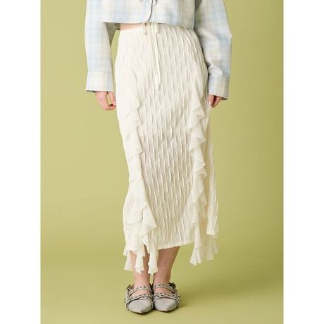 表面に表情のある伸縮素材のカットレースを使用したIラインスカート。スリット部分に流れるシフォンのラッフルフリルが歩くたびに揺れて華やかさを演出。ウエストのバインダーテープは前後どちらでも結んで着用可能です。着心地も抜群で、シンプルなトップスに合わせるだけで華やかさをプラスできる一着となっております。