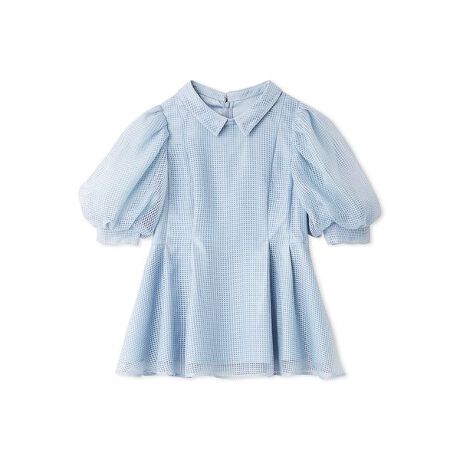袖の内側をチュールで吊ったバルーン仕様のパフデザインと、ウエストから程よくシェイプされたペプラムシルエットで、一枚で着映えするアイテムです。
