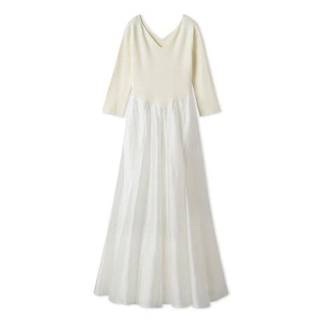 デコルテを美しく見せるハートネックニットと、分量感たっぷりのオーガンジースカートをドッキング。