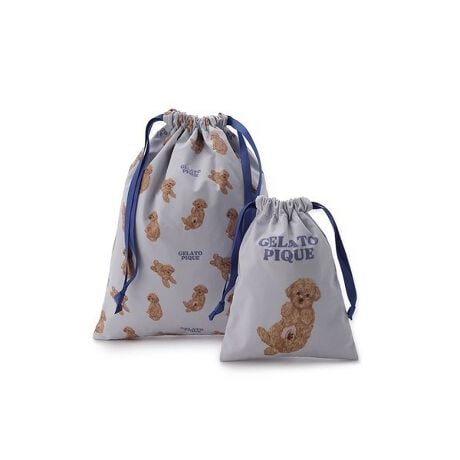ごろんと寝そべりお腹を見せたり、お座りしたり、いろんなポーズのワンちゃんをプリントしたドッグ柄シリーズの巾着セットです。旅行のパッキングにも重宝する大小2枚のセットアイテム。ワンポイントでドッグプリントが入った小サイズは、ヘアピンやリップなど細かいものに合うサイズ感。総柄プリントの大サイズは、下着やソックスなども入る大きさで仕上げました。色はポメラニアン柄のクリーム、ビションフリーゼ柄のライトピンク、トイプードル柄のブルーの3色展開。同シリーズのポーチやタオルと組み合わせたり、春の新生活や入学式などに向けたギフトにもおすすめです。