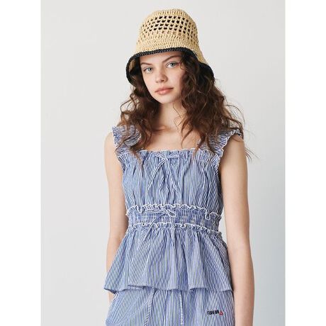 一枚での着用はもちろん、インナーをレイヤードしてビスチェのように着用もできるブラウス。ウエストはシャーリング仕様で程よく身体にフィットし、ウエスト周りをすっきりと見せてくれます。フロントのリボンとペプラムデザインが可愛らしい印象を与えてくれるアイテムとなっております。