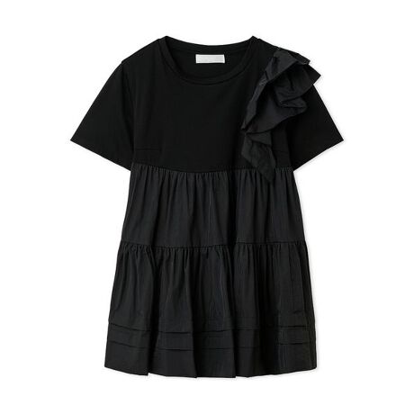ヨークと袖には伸縮性のあるカット素材を、ショルダーフリルとティアード部分にはハリのあるタフタ素材を使用したチュニックカットソー。肩のアシンメトリーなフリルデザインが顔まわりに華やかさを添えます。