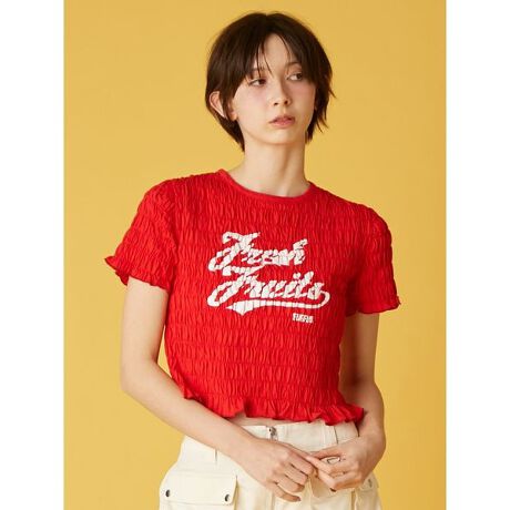 シャーリングを効かせた生地を使用し、身体に沿うコンパクトなシルエットを表現したTシャツ。カラーごとに異なるモチーフのグラフィックをプリント。トレンドのクロップド丈やハイウエストボトムと組み合わせやすいサイジングになっています。