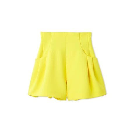 ハリ感のあるふっくらとしたジョーゼット生地で構築的なシルエットに仕立てたトレンド感のあるショートパンツです。立体的なタックを入れて仕上げた丸みのあるシルエットで、スタイリングにモード感をプラスします。ウエスト周りはすっきりとしたハイウエストで、スタイルアップ効果も抜群です。後ろウエスト位置にはゴムを入れ、フィット感をプラス。背中側コンシールファスナーで着脱可能。