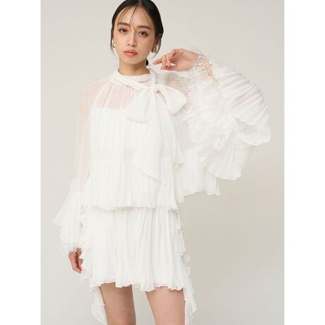 SNIDELで定番人気のシフォン素材のブラウスとショートパンツのセットアップをアップデート。トップスの袖口に繊細なレースをプラスし、フェミニンな雰囲気を引き立てます。程よい透け感、そして落ち感のある楊柳生地をセレクトし、ランダムプリーツを効かせてエレガントに仕上げました。ブラウスは、ボウタイリボンデザインで顔まわりを華やかに彩ります。ゆったりとした身頃や袖がリラクシーなデザインです。袖口は華やかなベルスリーブで華奢なレースをレイヤードさせました。後ろ首元のボタンで着脱可能です。セットのショートパンツは、サイドに流れるような長めのラッフルフリルをプラス。スカート風デザインですがショートパンツの裏地が付いているので安心。ウエストがゴムで、楽ちんに着脱いただけるデザインです。ブラウスは細身のパンツと合わせたり、ショートパンツはニットやスウェットトップスと合わせたり、それぞれ単品使いもできて着回し力も抜群。セットでご着用いただくことでドレッシーな装いに。
