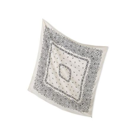 ペイズリー柄のバンダナスカーフです。素材が軽く滑らかで、美しいドレープが出るのが特徴です。バッグのハンドルに巻いたり、ヘアスタイリングのアクセントにしたり、胸元に巻き付けてビスチェのようにスタイリングするのもおすすめです。