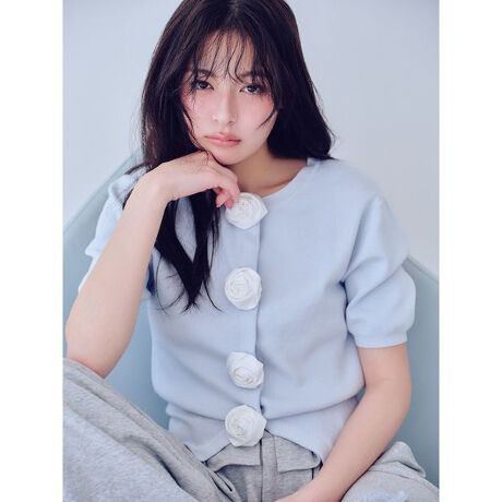 フロントに施した大きなサテンローズが印象的な主役級カーディガン。