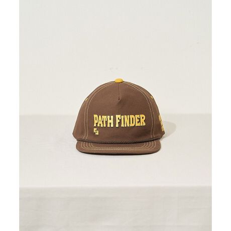 「PATH FINDER」ロゴを大胆にあしらったキャップ。落ち着いたブラウンにイエロー刺繍が映え、つば縁に配したロープディテールと表情のあるステッチワークが、ほどよいヴィンテージ感を演出します。