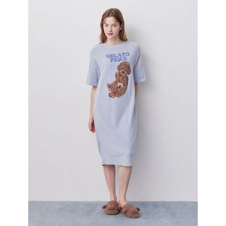 ごろんと寝そべりお腹を見せるワンちゃんを描いたニットシリーズです。なめらかでとろけるような肌触りのニットを使用した、半袖のジャガードワンピース。身幅にゆとりを持たせ、楽な着心地に仕上げています。甘えん坊な表情や、ほんのりピンクなお腹の色まで表現した絵柄が、袖を通すたびに心を癒してくれそう。色は全3色で、トイプードル柄のブルー、ポメラニアン柄のクリーム、ビションフリーゼ柄のライトピンクをご用意しました。同シリーズのブランケットやルームシューズと合わせるのがおすすめ。HOMMEアイテムとのリンク・コーディネートもお楽しみいただけます。
