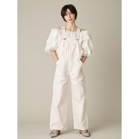 「Lee」のオーバーオールをベースにFURFURオリジナルカラーで作成した一着。後ろポケットにFURFURのロゴ刺繍を入れています。ゆとりのある腰回りからつながるすっきりとしたワイドストレートシルエットで、カジュアルながら着用すると女性らしさを演出できるアイテムです。フリルのブラウスや肌見せできるオフショルトップスなど、フェミニンなアイテムとのコーディネートがおすすめです。