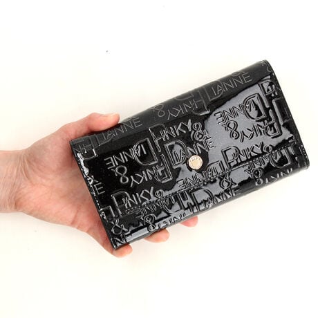 [型番:PDLWJBT1]大きめのPDロゴを型押しした革にエナメルを流し込み、立体感と透明感を出した素材のお財布小物シリーズ。日本の熟練した職人が手がけた奥行きのある革を使用しています。中央にはあえて控えめな丸いボタンとつけ、素材の良さが前面に出るデザインに仕上げました。
