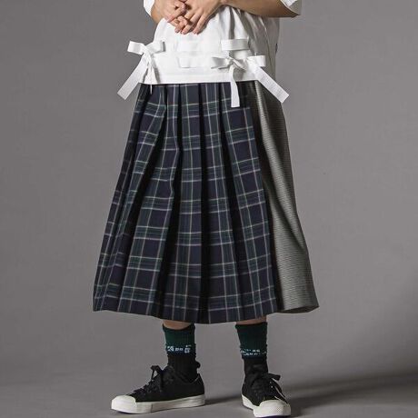 スカートのチェックと無地の切り替えが目を惹くスカート。