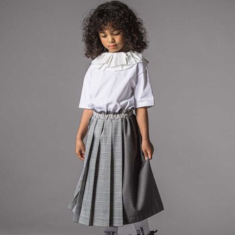 スカートはフロントはプリーツ加工バックにはギャザーを入れ、変化のあるシルエットに。