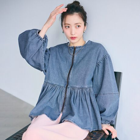 ウエスト切り替えにギャザーを施した、立体感のあるデニムアウター。