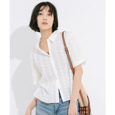 小花柄のレースが全面に施された、爽やかな印象の半袖シャツ。