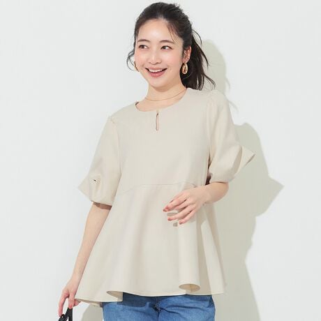 ふんわりとしたボリューム袖と、ウエストから広がるペプラムシルエットが印象的な一枚。