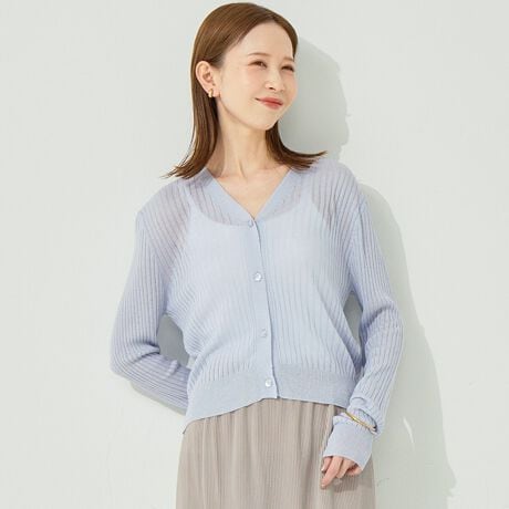 縦リブデザインがすっきりとした印象を与えるシアーニットカーディガン。