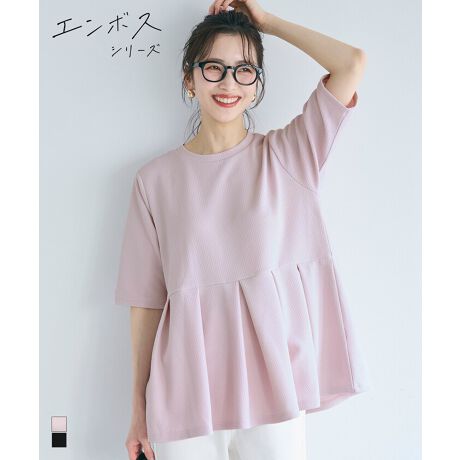 立体感のあるエンボス素材と、ウエスト切り替えのタックデザインがポイント。