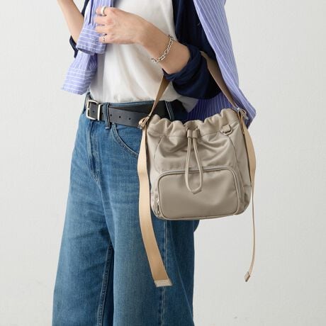 巾着の絞り具合やショルダーベルトの長さ調整によって、表情を変えて楽しめるデザイン。