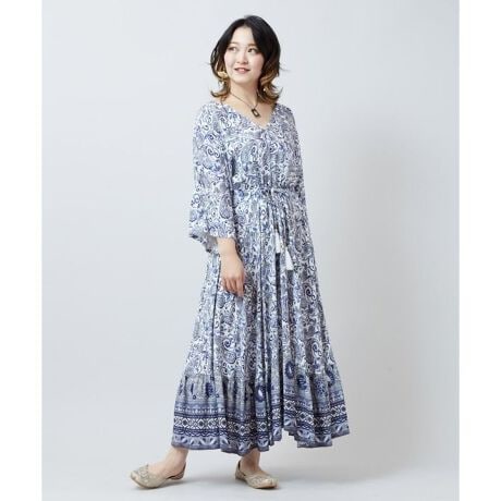 [型番:IAC-6172-2026]ゆったりと広がるフレアシルエットが美しいワンピース。繊細なペイズリー柄が全体に施され、裾にもエスニック感溢れる模様がプリントされています。ウエストの紐とタッセルがアクセントになり、シルエットを変えることで着こなしの幅も広がります。軽やかな素材感で普段使いはもちろん、旅やおでかけにもおすすめです。