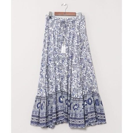 [型番:IAC-6173-2026]動くたびにふんわりと揺れるシルエットが魅力のロングスカート。繊細なペイズリー柄に、裾のブロックプリント風デザインがアクセント。ウエストはゴム仕様で着心地もらくちん。タッセル付きの紐がさりげないポイントに。トップスをインしたスタイルや、旅先でのリラックスコーデにもおすすめのアイテム。