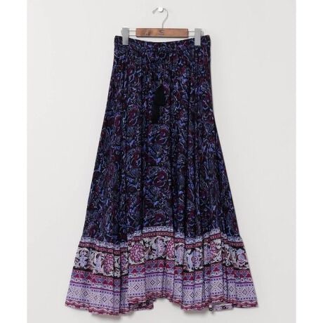[型番:IAC-6173-2026]動くたびにふんわりと揺れるシルエットが魅力のロングスカート。繊細なペイズリー柄に、裾のブロックプリント風デザインがアクセント。ウエストはゴム仕様で着心地もらくちん。タッセル付きの紐がさりげないポイントに。トップスをインしたスタイルや、旅先でのリラックスコーデにもおすすめのアイテム。