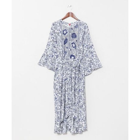 [型番:IAC-6175-2026]ブロックプリントをイメージしたデザインが目を引くカーディガン。草花をモチーフにしたペイズリー模様が上品な雰囲気を演出。ゆとりのあるシルエットとさらりとした軽やかな風合いで、羽織るだけでエスニックな雰囲気に。旅先や季節の変わり目のおでかけにおすすめのアイテム。