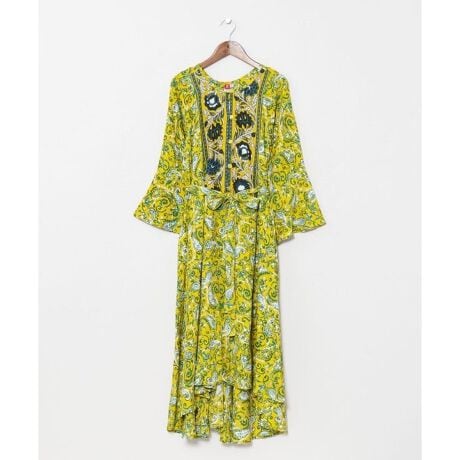 [型番:IAC-6175-2026]ブロックプリントをイメージしたデザインが目を引くカーディガン。草花をモチーフにしたペイズリー模様が上品な雰囲気を演出。ゆとりのあるシルエットとさらりとした軽やかな風合いで、羽織るだけでエスニックな雰囲気に。旅先や季節の変わり目のおでかけにおすすめのアイテム。