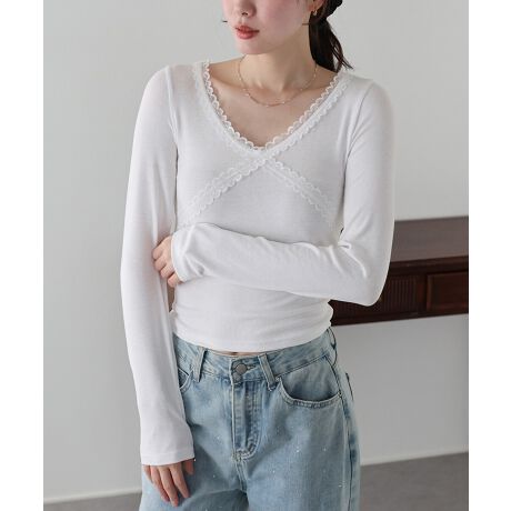 シンプルの中に大人の甘さをプラスしたクロスレースカットソー