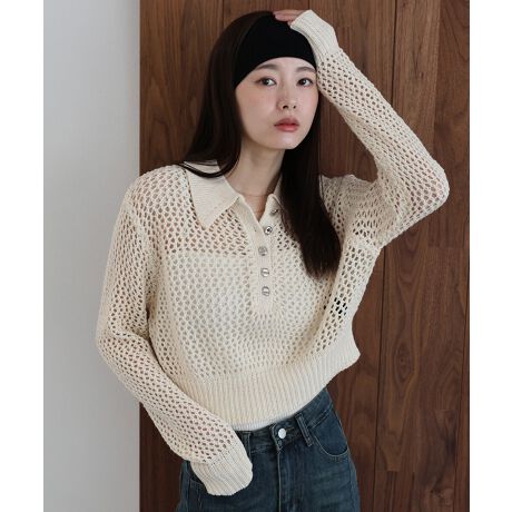 春夏らしいヘルシーな肌見せを叶える、大ぶりなメッシュ編みが目を惹くポロニット。