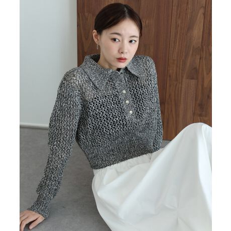 春夏らしいヘルシーな肌見せを叶える、大ぶりなメッシュ編みが目を惹くポロニット。